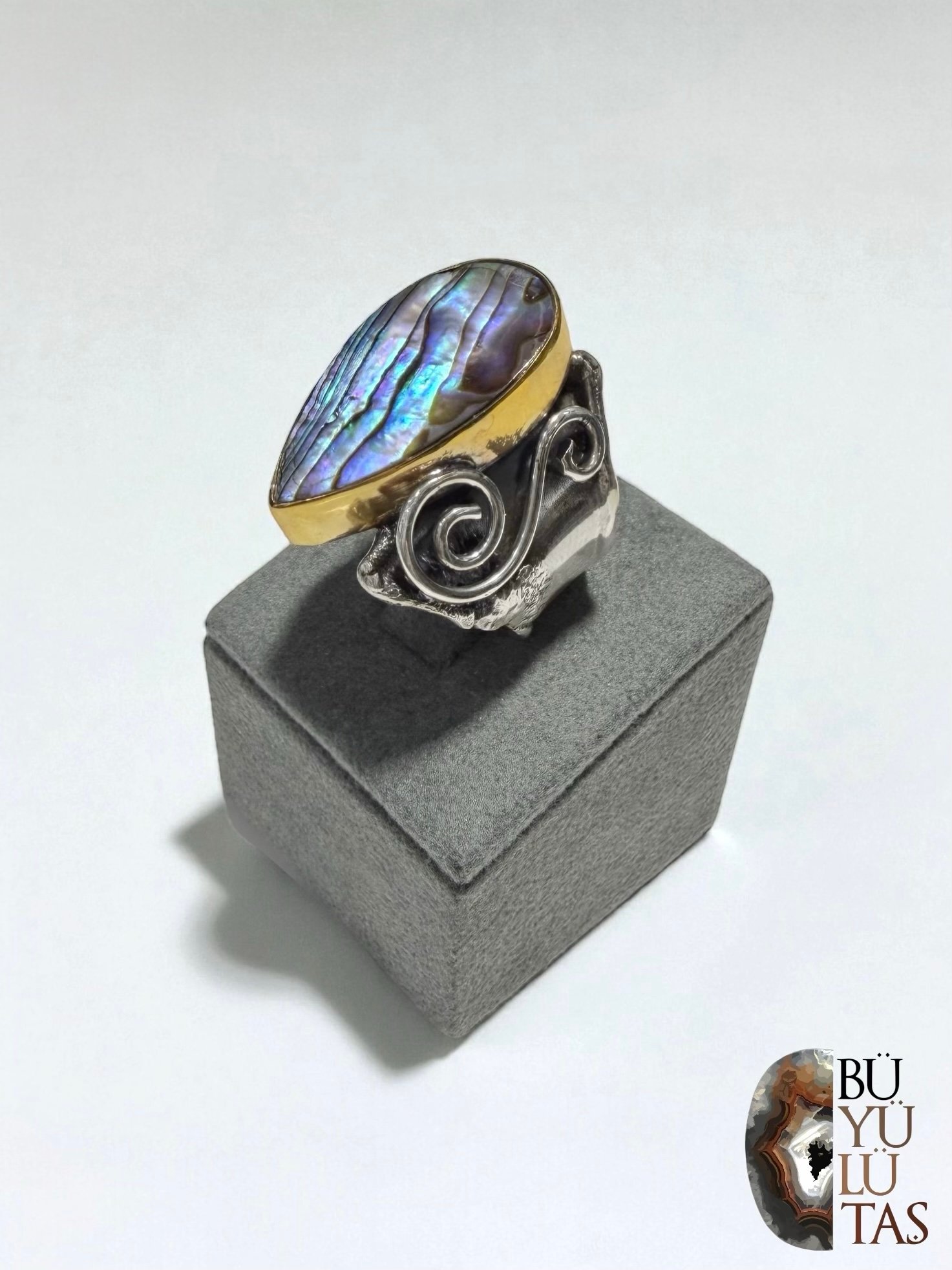 Abalone Taşlı Altın Çerçeveli Tasarım Gümüş Yüzük