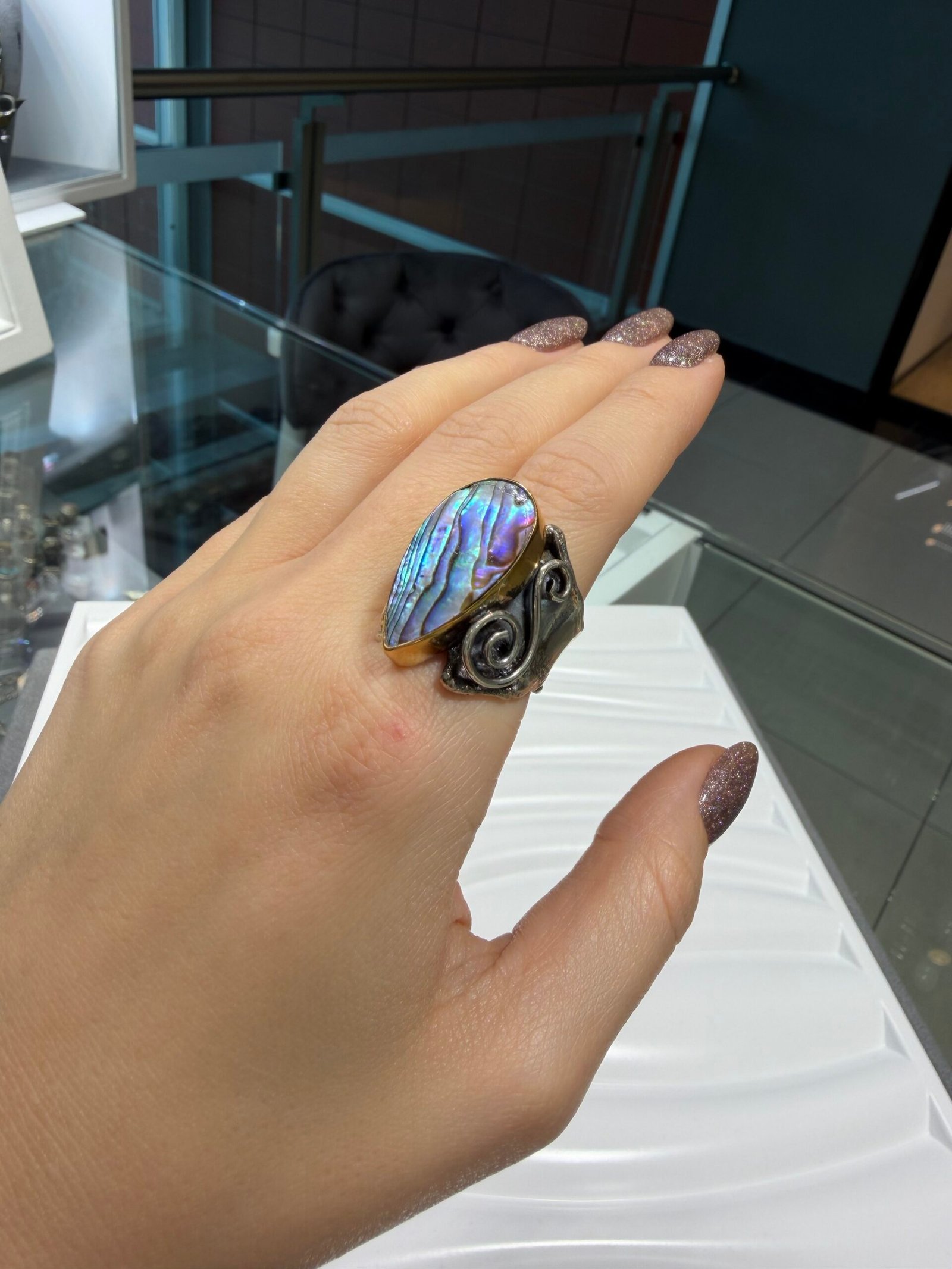 Okyanusun büyüleyici renklerini parmağınıza taşıyan bu tasarım yüzük, doğal abalone taşının eşsiz desenleriyle dikkat çeker. El işçiliği ile hazırlanmış yüzüğün formu, dalga kıvrımlarını andıran detaylarla tamamlanırken, abalone taşını saran altın renkli çerçeve modele zarif bir kontrast katar.