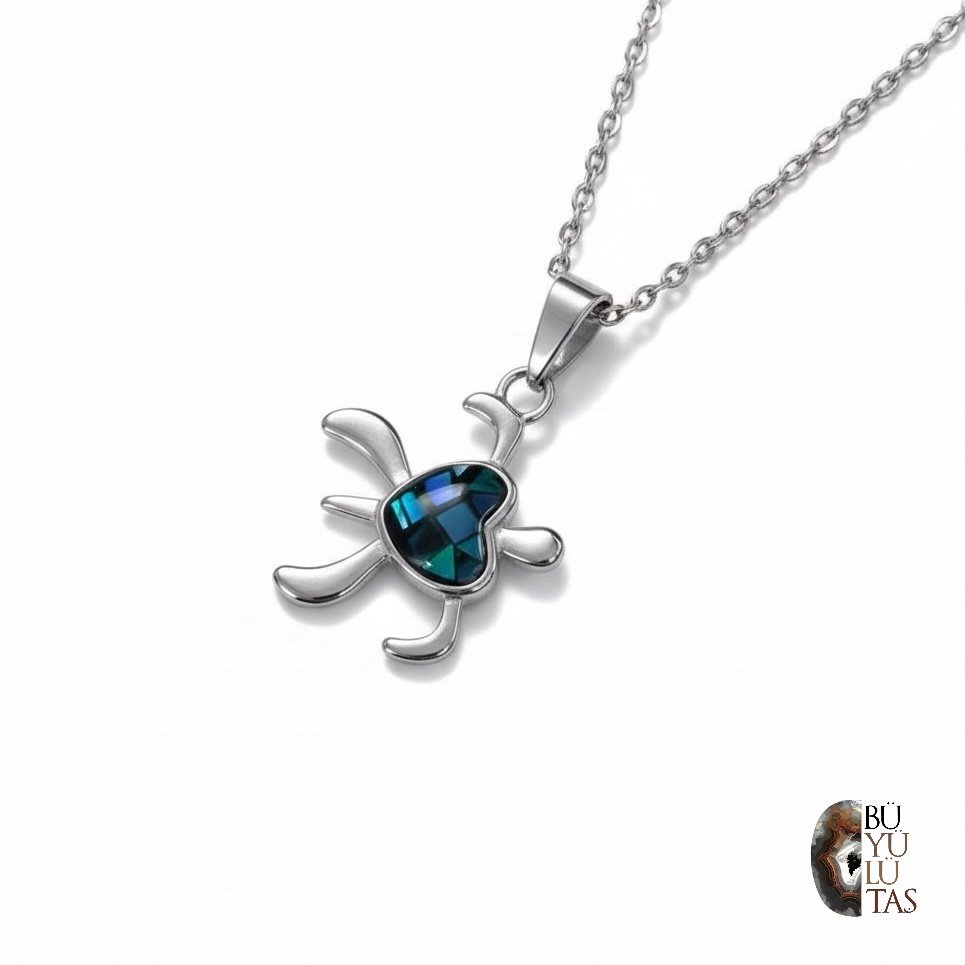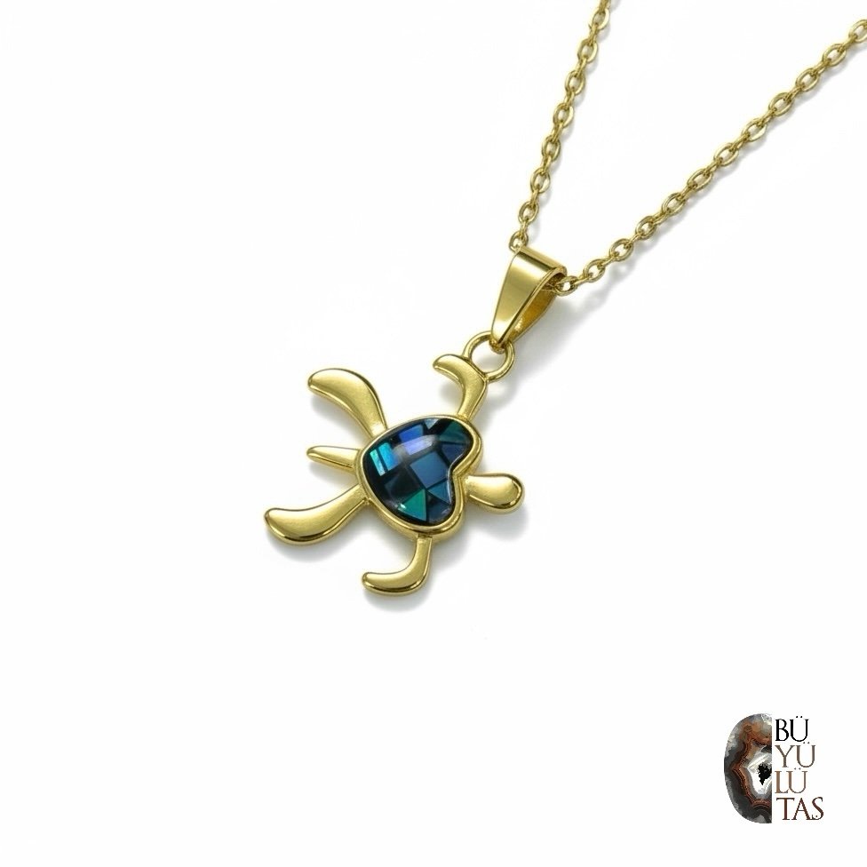 Kaplumbağa figürü; uzun ömür, şans, koruma ve bereketi simgeler. Orta kısımda kullanılan abalone taşının doğal ışık oyunları, kolyeye benzersiz bir derinlik ve canlılık kazandırır.