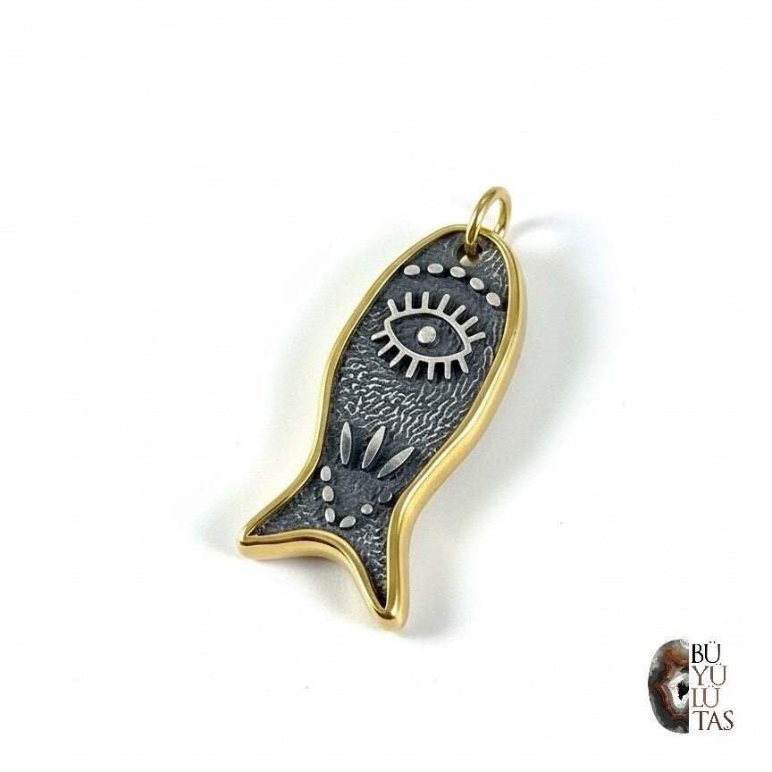 Otantik dokusu ve sembolik detaylarıyla öne çıkan bu tasarım kolye ucu, balık formu üzerinde yer alan göz ve motif detaylarıyla güçlü bir nazarlık etkisi taşır. Ürün 925 ayar gümüşten üretilmiş olup yüzeyi oksitlidir; dış çerçevesi ise 22 ayar altın kaplama ile tamamlanmıştır. El işçiliği doku efekti sayesinde benzersiz bir görünüm sunar.