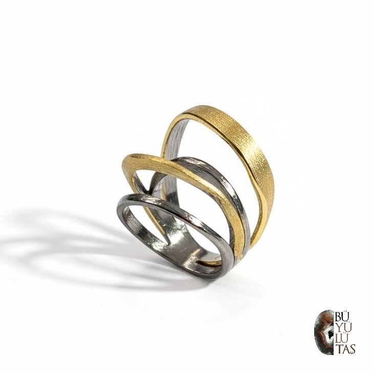 Organik dalga formlarından ilham alınarak hazırlanan bu modern yüzük, 925 ayar gümüş üzerine uygulanan oksit dokusu ve 22 ayar altın kaplama detaylarıyla sıra dışı bir kontrast sunar. Birbirine dolanan üç form, hem minimal hem heykelsi bir görünüm oluşturur. El işçiliğiyle şekillendirilen yüzük modeli parmak üzerinde akıcı bir hareket hissi verir.
