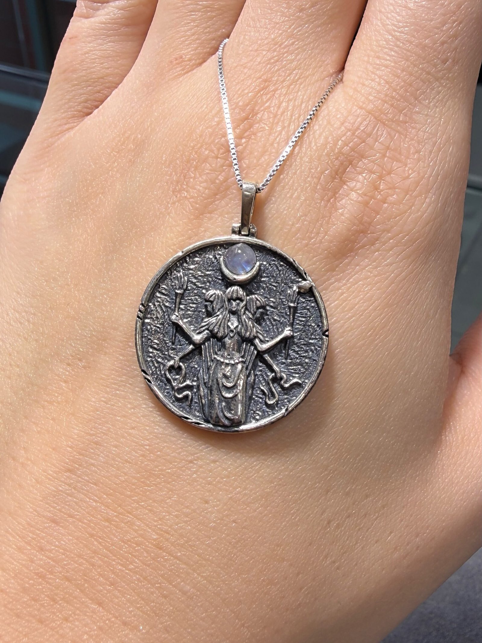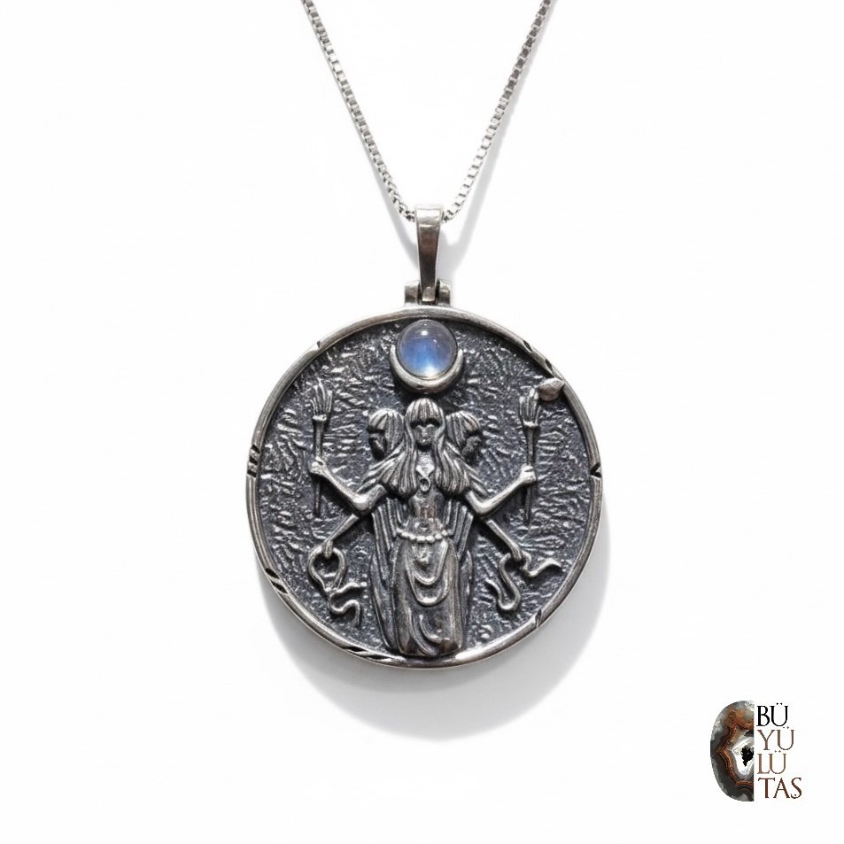 Kolye üzerindeki meşale, yılan ve çok kollu semboller, tanrıçanın karanlığı aydınlatan, dönüşümü başlatan ve koruyucu niteliklerini yansıtır. Üst kısmında yer alan orijinal ay taşı, Hekate’nin Ay ile olan mistik bağını güçlendirirken sezgiyi, içsel farkındalığı ve spiritüel enerjiyi temsil eder.