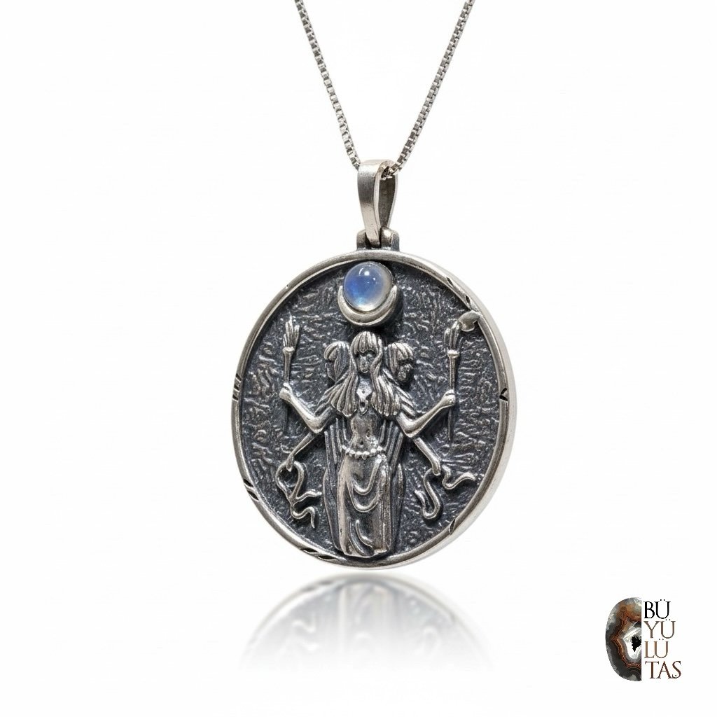 Antik Yunan mitolojisinin büyü, sezgi ve koruyucu dişil enerjisiyle özdeşleşen Hekate figürünün işlendiği bu özel tasarım kolye, 925 ayar gümüşten üretilmiştir. Hekate’nin üçlü formdaki tasviri, onun geçmiş–şimdi–gelecek arasındaki bilge duruşunu ve yol ayrımlarında rehberlik eden yönünü simgeler.