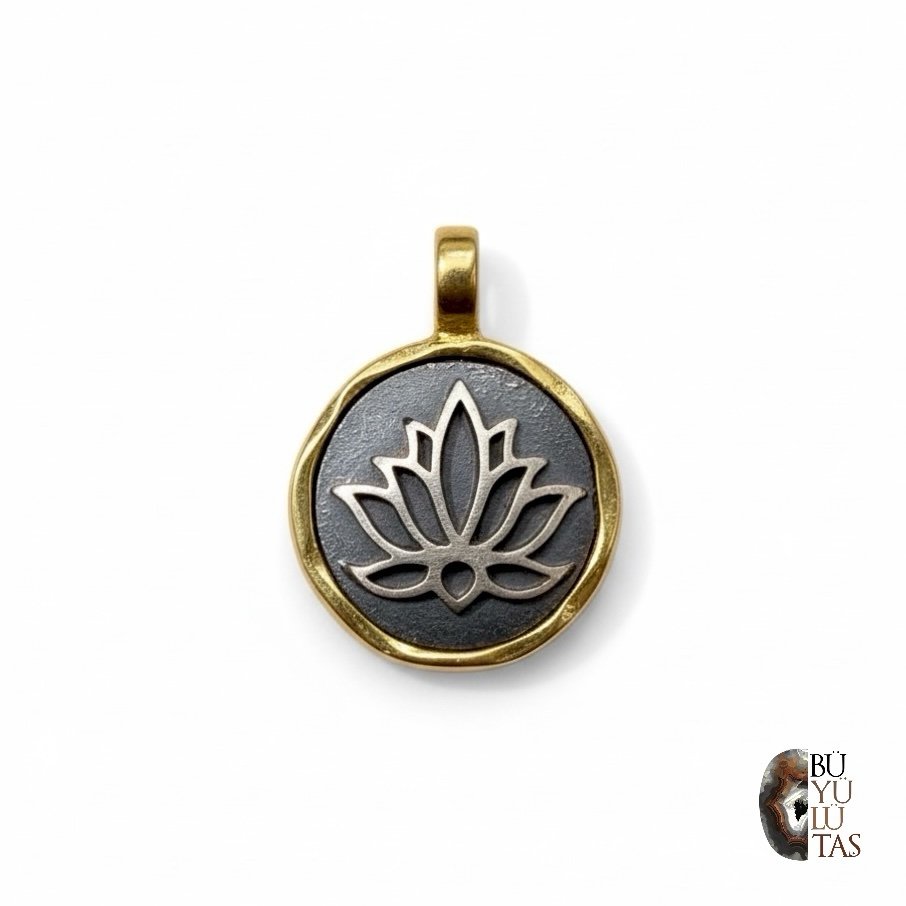 Bu özel kolye ucu, lotus çiçeğinin aydınlanma ve arınma enerjisinden ilham alınarak hazırlanmıştır. Ürünün dış çerçevesi altın kaplamadır, iç kısım ise oksitli tonu ve gümüş lotus motifiyle güçlü bir kontrast oluşturur.