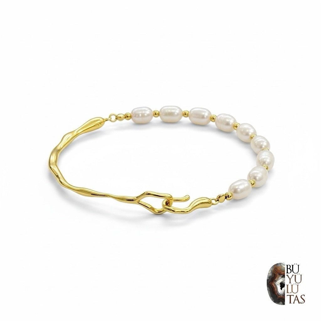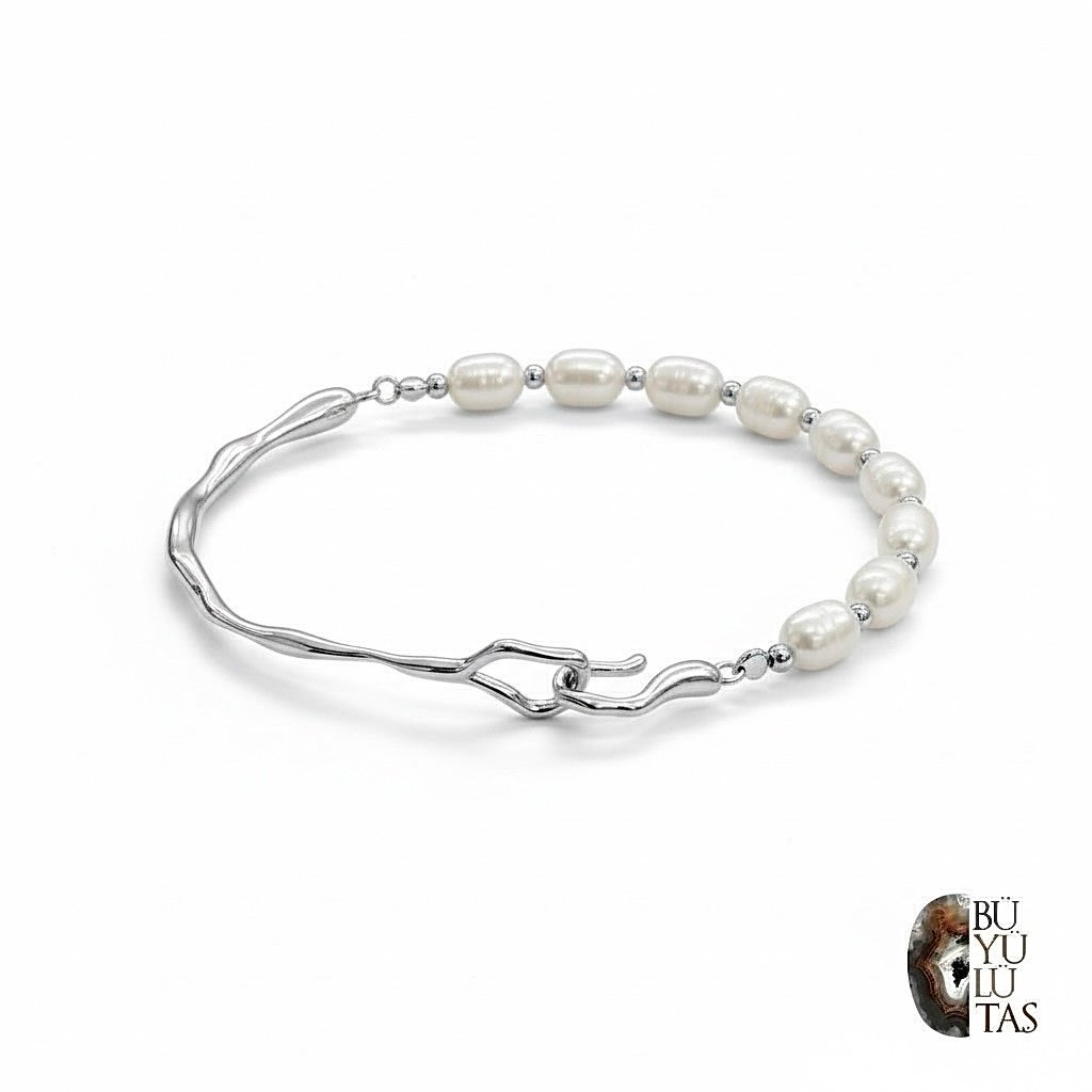 Zarafetin doğal inci ışıltısıyla buluştuğu bu özel tasarım bileklik, yarı bilezik formunda katı yapı ve yarı doğal inci dizilimiyle modern ve şık bir görünüm sunar. Tasarım T kilit biçimindeki özgün kapanışı sayesinde hem farklı hem de güvenli bir kullanım sağlar.