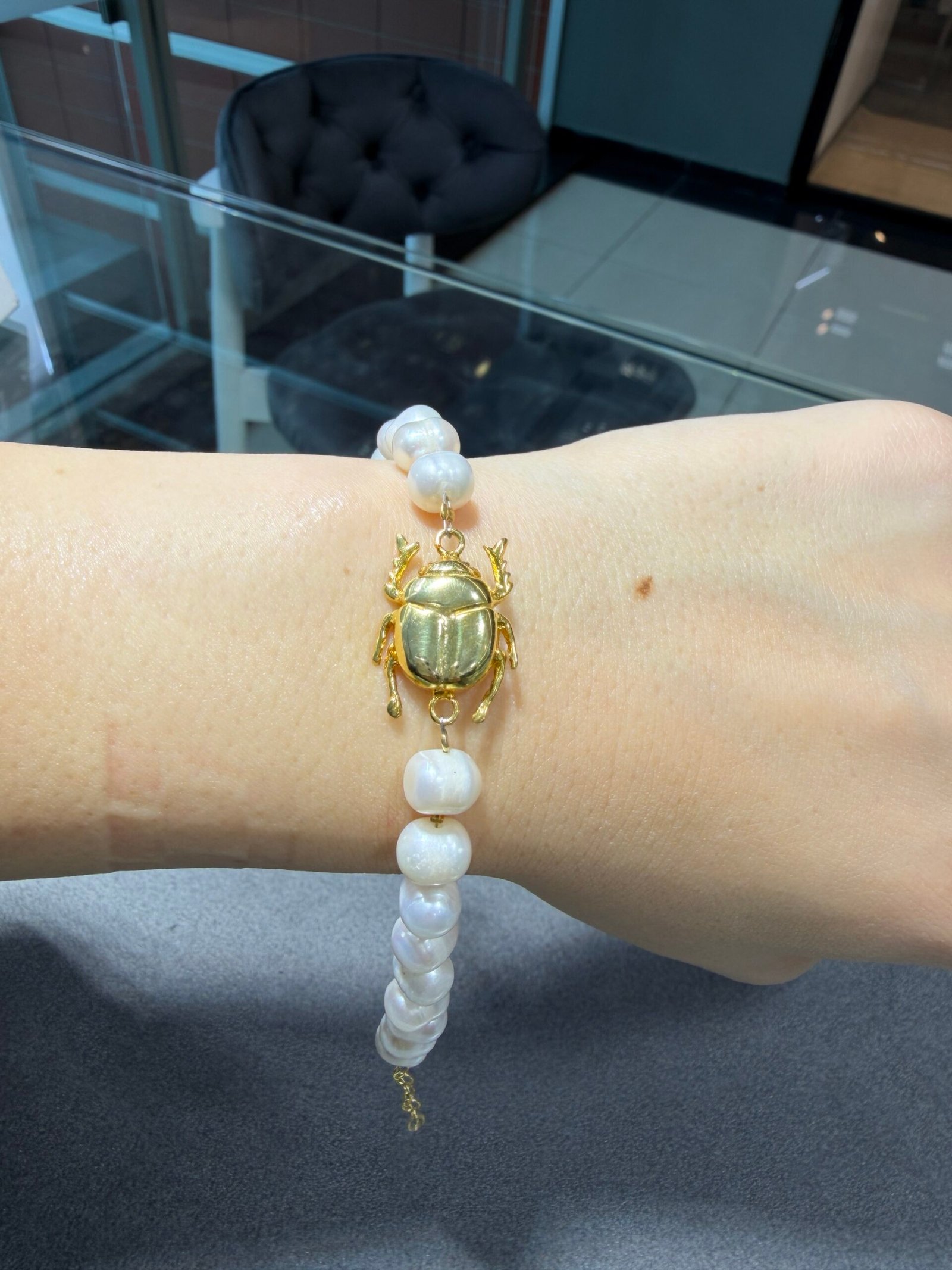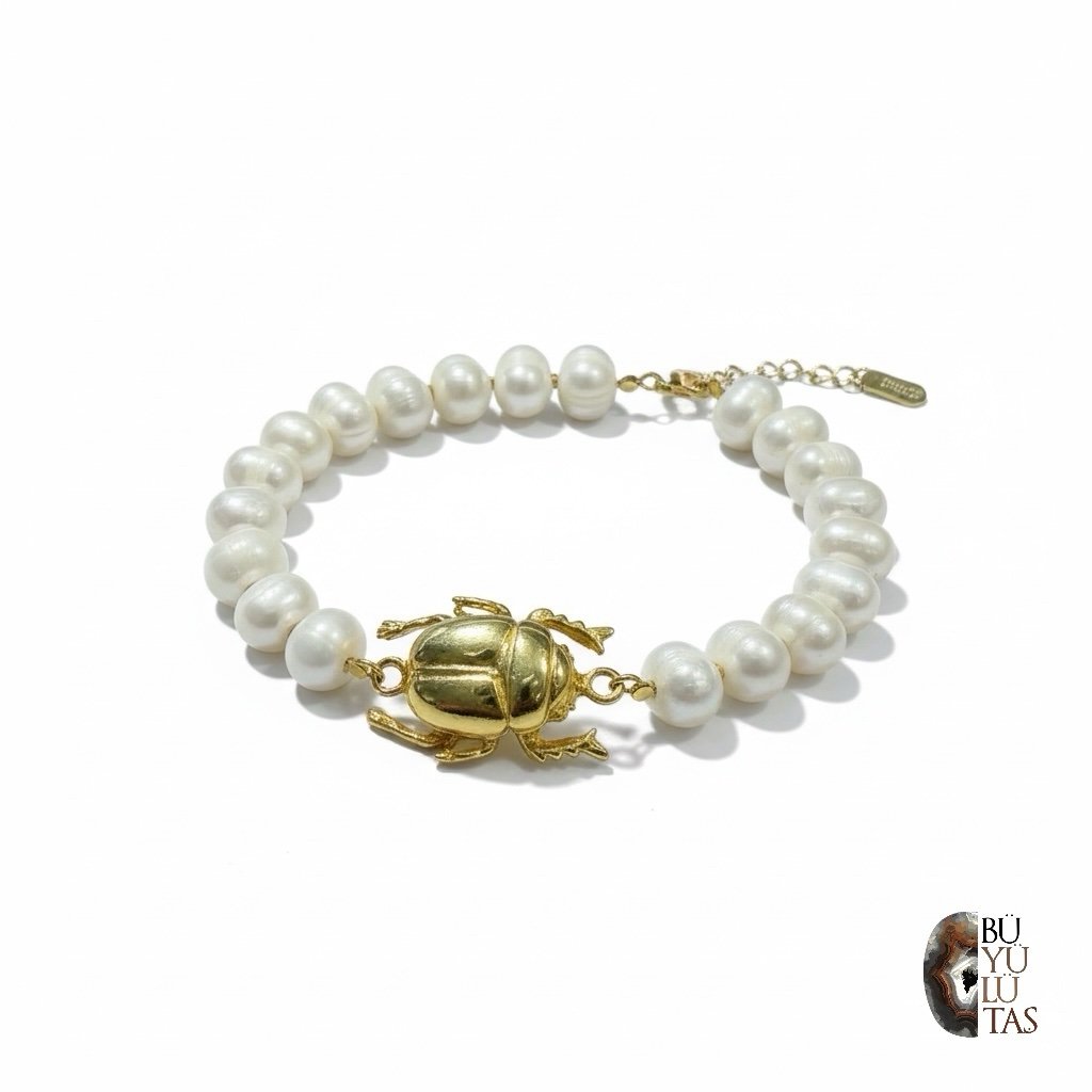 Antik Mısır’ın koruyucu sembolü skarab böceğinden ilham alınarak tasarlanan bu özel bileklik, doğal incilerin zarafeti ile 925 ayar gümüş üzerine 22 ayar altın kaplamanın ihtişamını bir araya getiriyor. El işçiliği detaylarıyla hazırlanmış skarab figürü, bilekliğe mistik ve şık bir dokunuş katarken incilerin doğal parlaklığıyla kusursuz bir uyum sağlıyor.