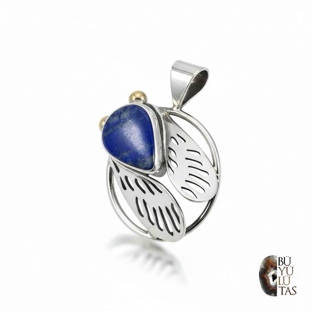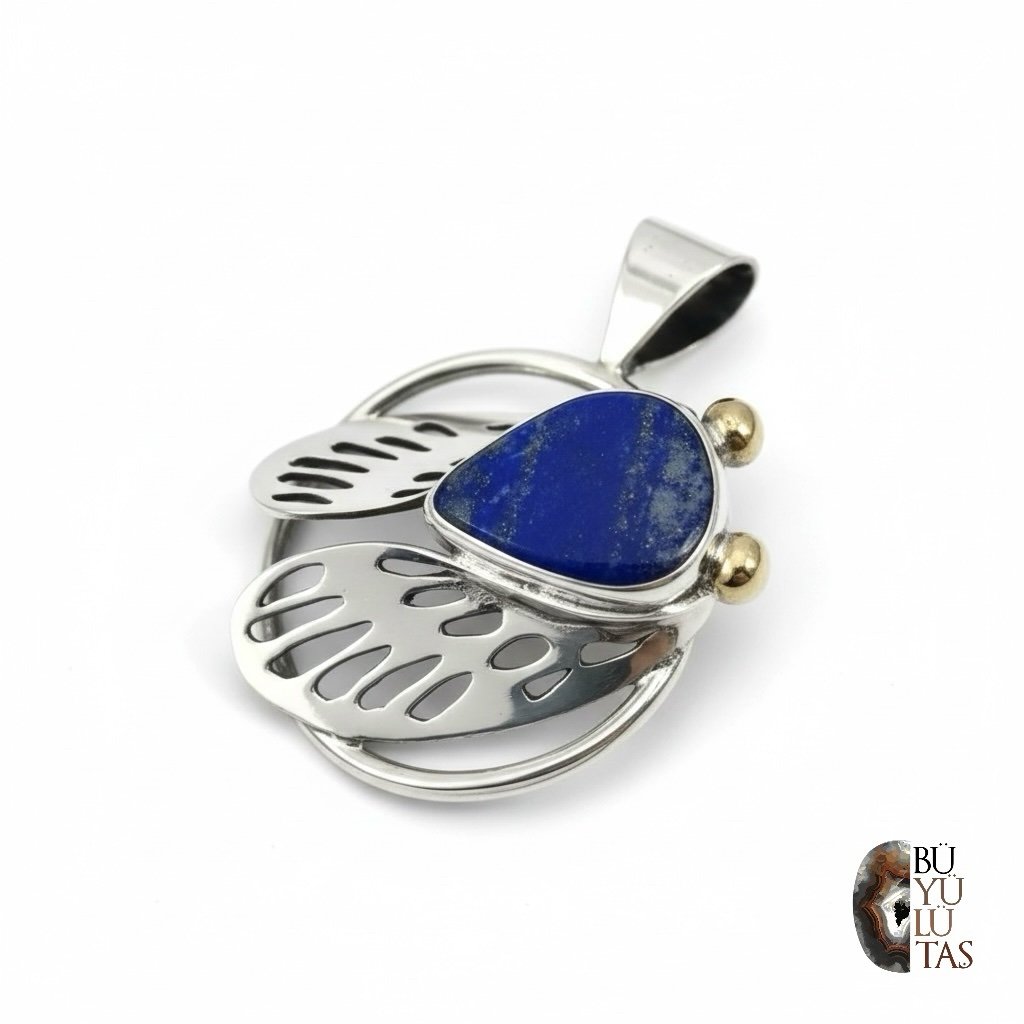Derin gece mavisi rengiyle dikkat çeken lapis lazuli taşı, modern kesimli gümüş detaylarla birleşerek güçlü ve özgün bir tasarıma dönüşüyor. Tamamen 925 ayar gümüşten üretilen bu el işçiliği kolye ucu, parlak yüzeyli metal formu ve iç içe geçmiş açık kesim motifleriyle çağdaş bir estetik sunar.