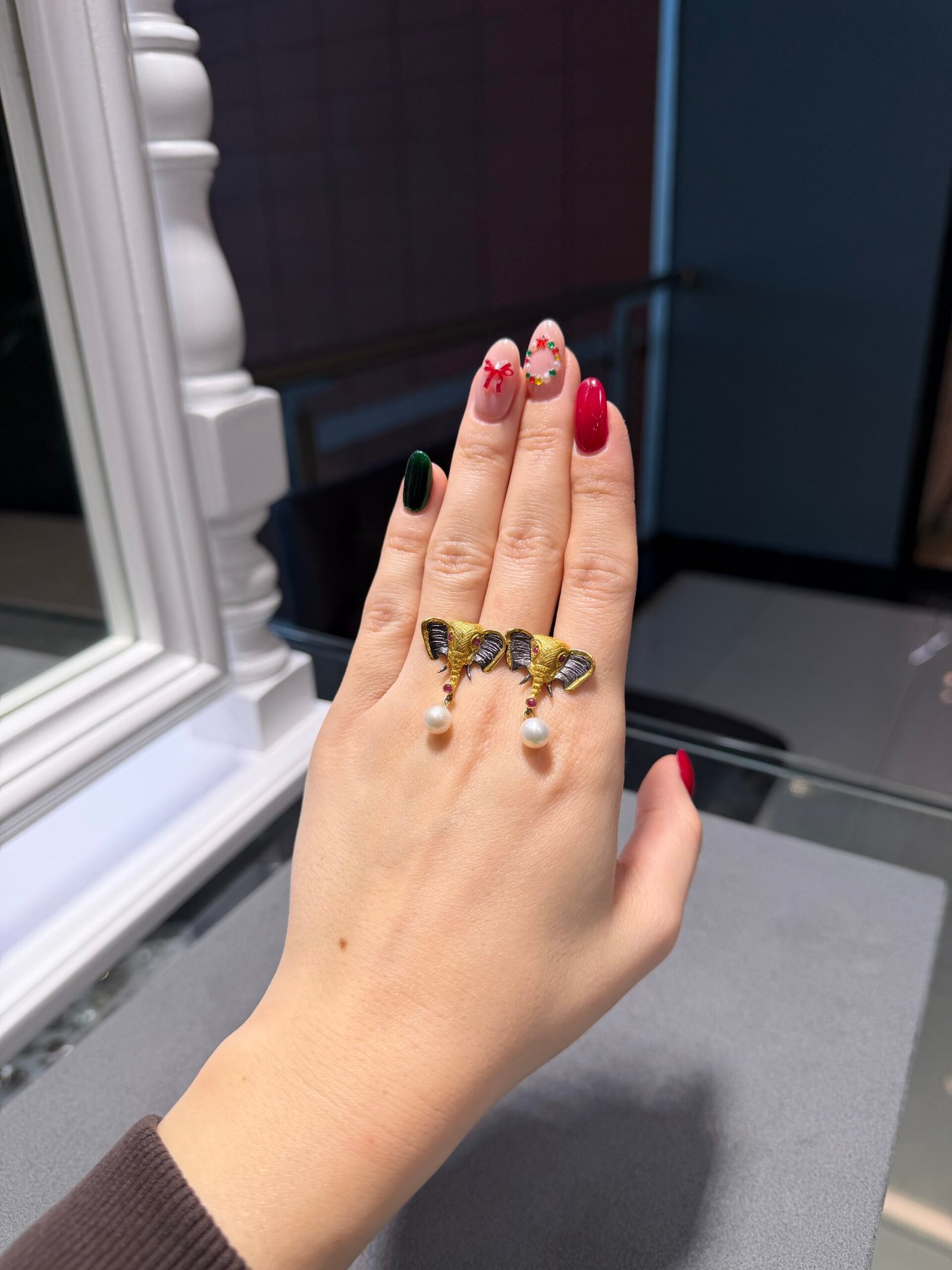 Altın tonlu yüzey ile oksitli detayların dengeli birlikteliği, fil formunun dokusunu öne çıkarır ve tasarıma antik bir karakter kazandırır. Gerçek yakut taşlarının canlı kırmızı tonu, incinin yumuşak parlaklığıyla kontrast oluşturarak sofistike ve dikkat çekici bir görünüm sunar.