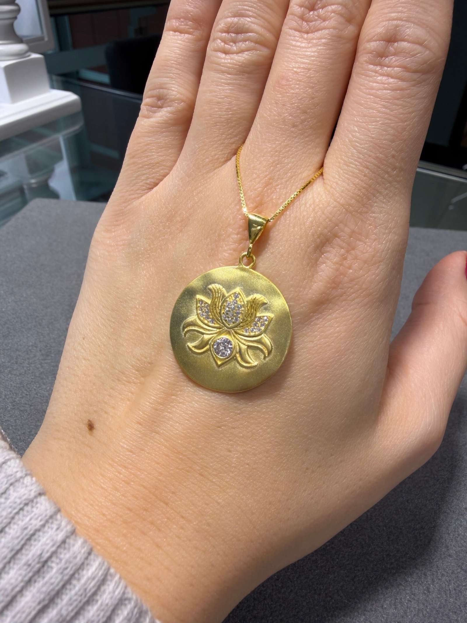 Altın kaplama gümüş zirkon taşlı lotus çiçeği madalyon kolye
