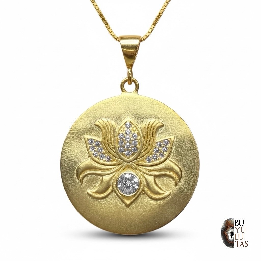 Lotus Çiçeği Motifli Altın Kaplama Gümüş Madalyon Kolye