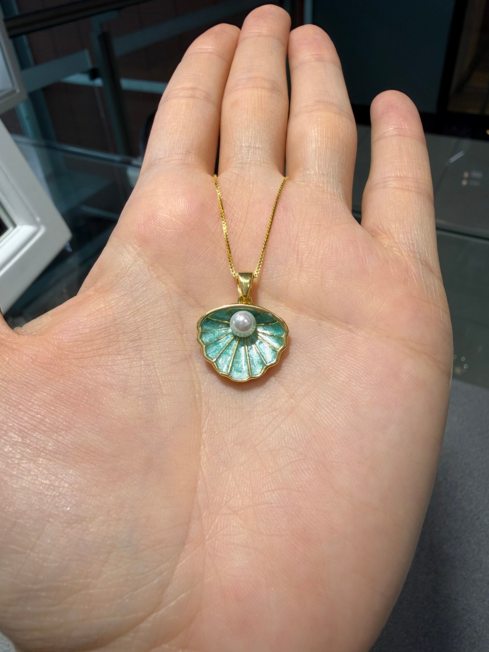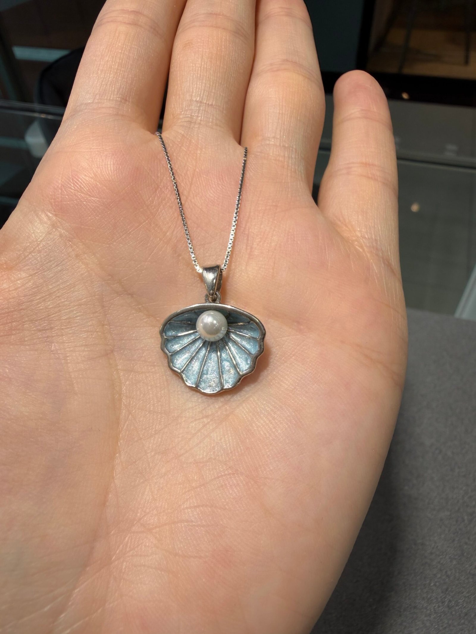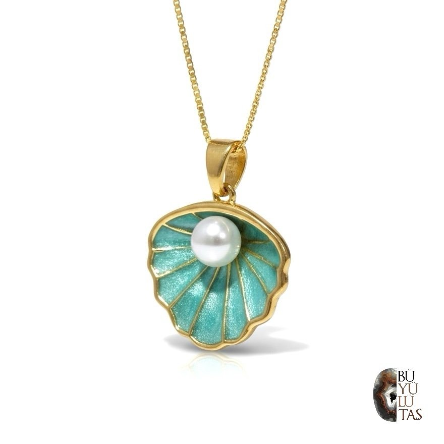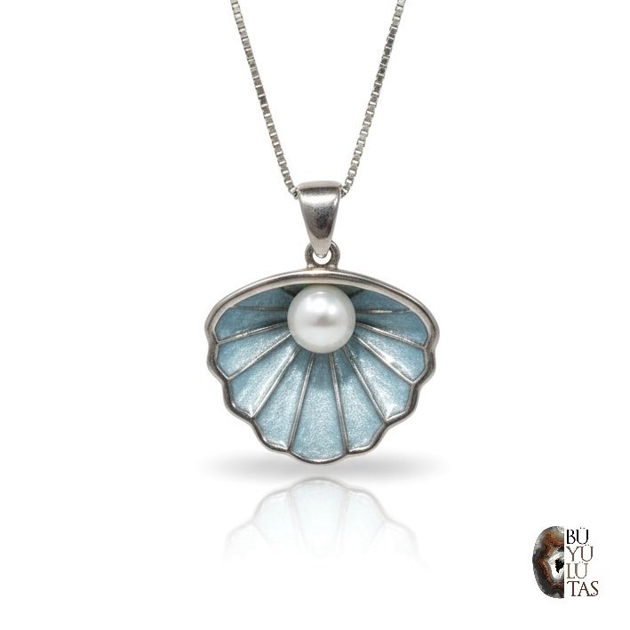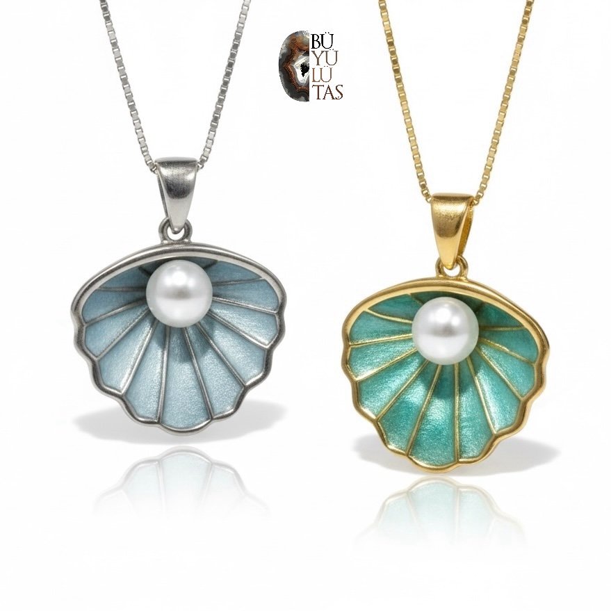 Denizin zarif formundan ilham alınarak tasarlanan bu özel kolye, deniz kabuğu silueti ve merkezinde yer alan orijinal inci detayıyla sade ama etkileyici bir görünüm sunar. Ürünün üst yüzeyi mine ile renklendirilmiştir; sedef içermez. Mine uygulaması sayesinde yüzey pürüzsüz, parlak ve canlı bir görünüme sahiptir.