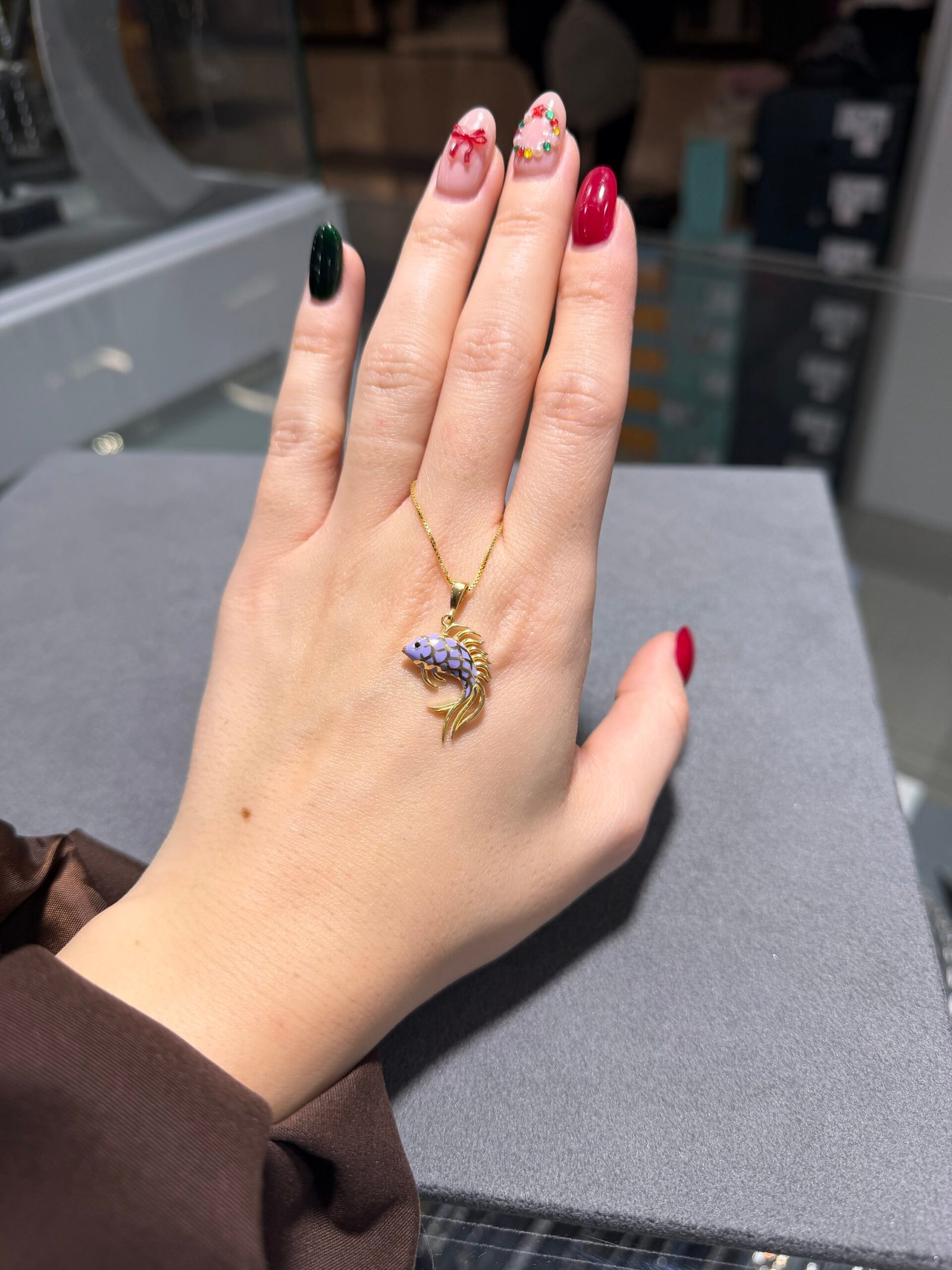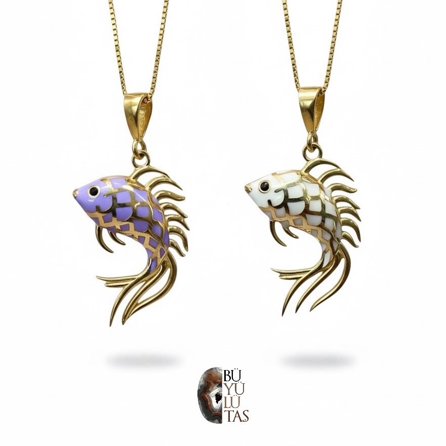 Zarif balık figüründen ilham alınarak tasarlanan bu özel kolye, el işçiliği detayları ve mineli yüzeyiyle dikkat çeker. Balığın pul formu, özenle uygulanan mine tekniğiyle renklendirilmiş; akıcı hatlara sahip altın kaplama çerçeve ile modern ve zarif bir bütünlük oluşturulmuştur.