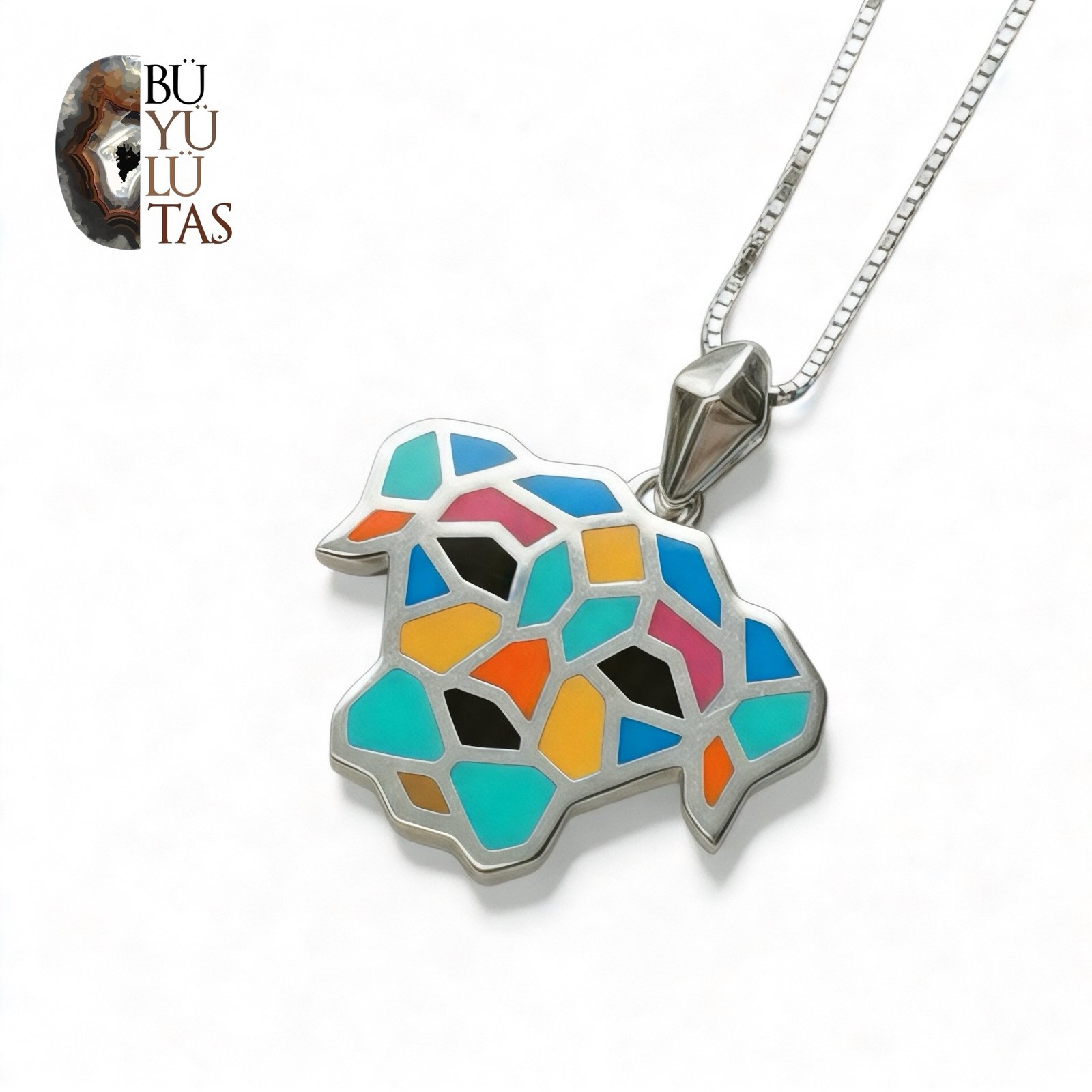 Modern sanat esintilerini taşıyan bu mozaik tasarım köpek figürlü gümüş kolye, canlı mine renkleriyle öne çıkan tamamen özel imalat bir tasarım mührüdür. Figürün üzerini oluşturan çok renkli mine detayları, kolyeye hem enerjik bir karakter hem de benzersiz bir estetik kazandırır.