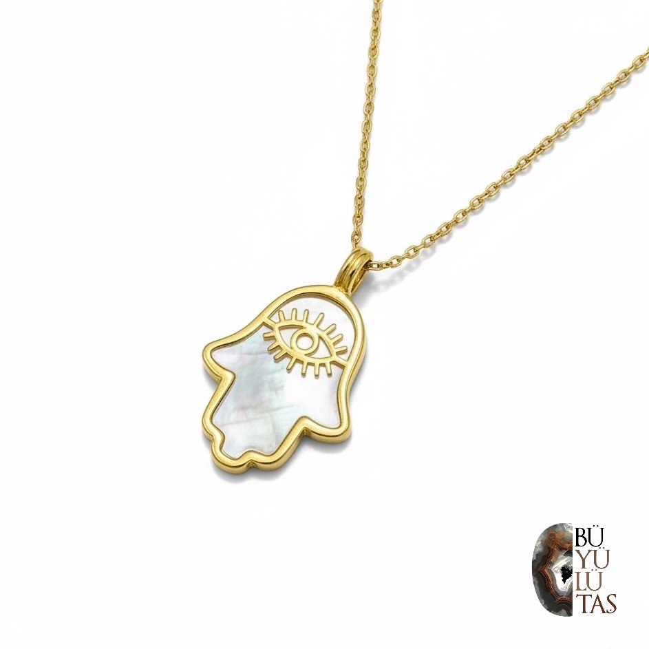 Sedef İşlemeli Göz Motifli Fatma Ana Eli Kolye – Altın Kaplama & Gümüş Renk Seçenekli