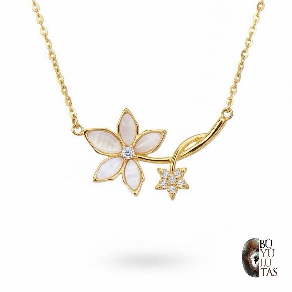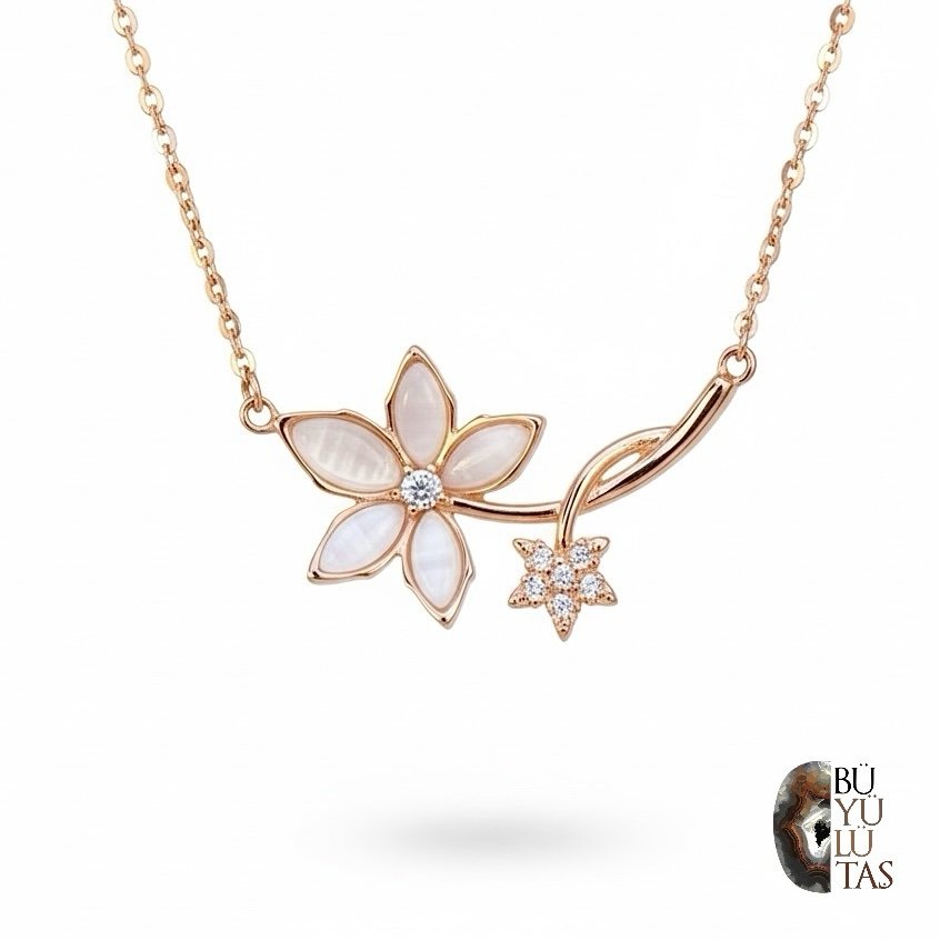 Romantik çiçek formunda tasarlanan bu zarif kolye, günlük şıklığınızı ve özel gün kombinlerinizi zarifçe tamamlar. Biri büyük diğeri küçük iki çiçek ve kıvrımlı dal detayıyla boyunda hafif ve elegan bir duruş sağlar.