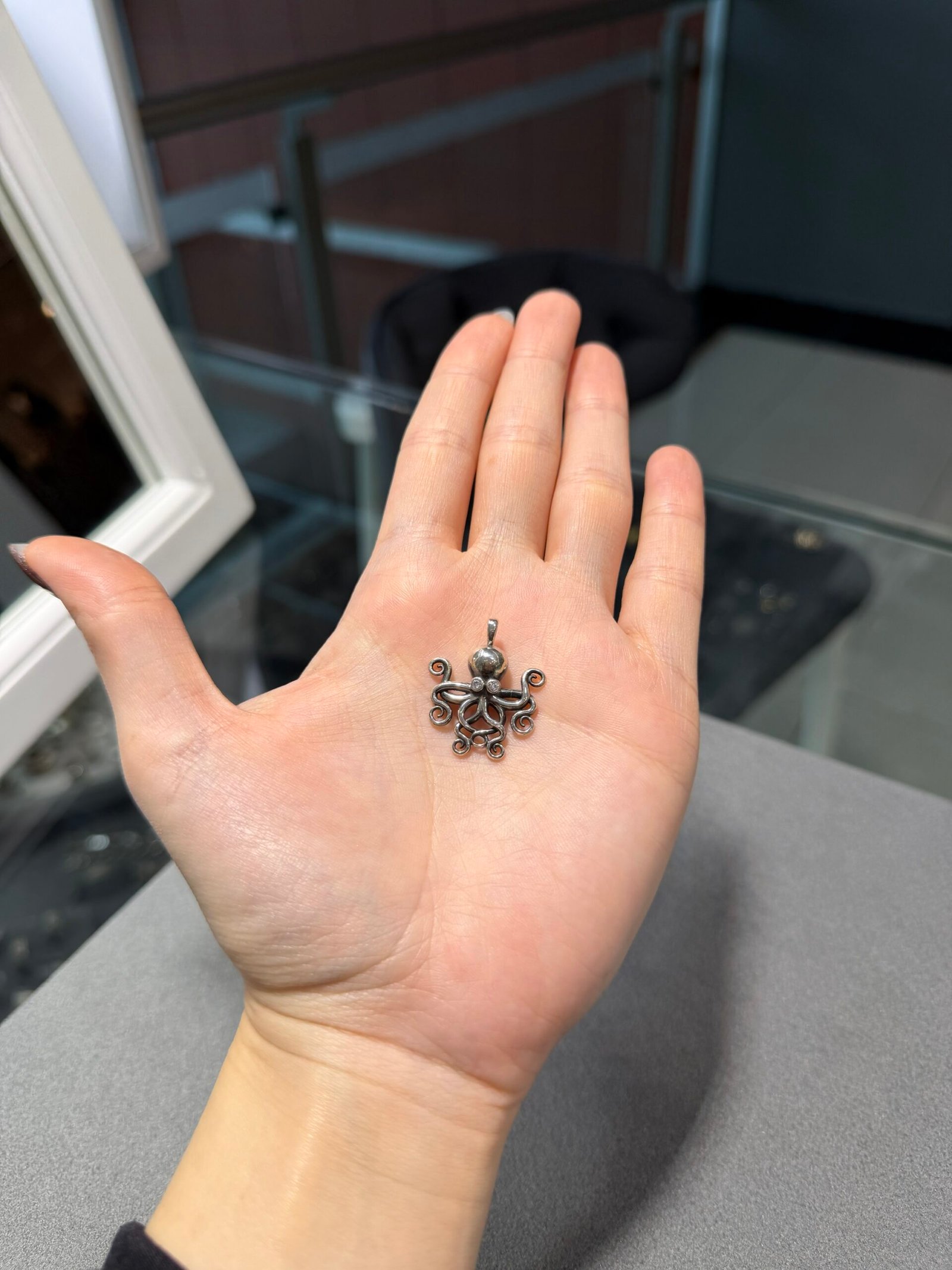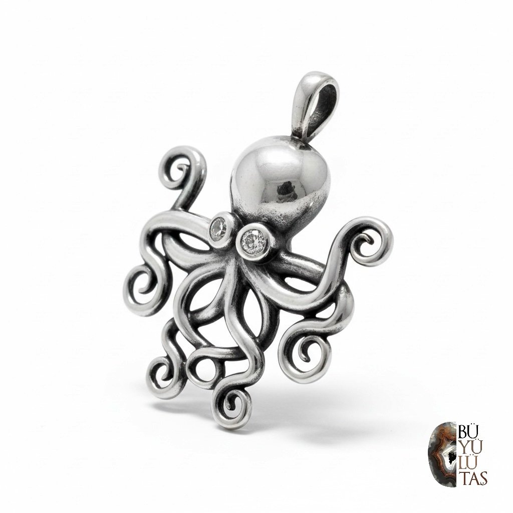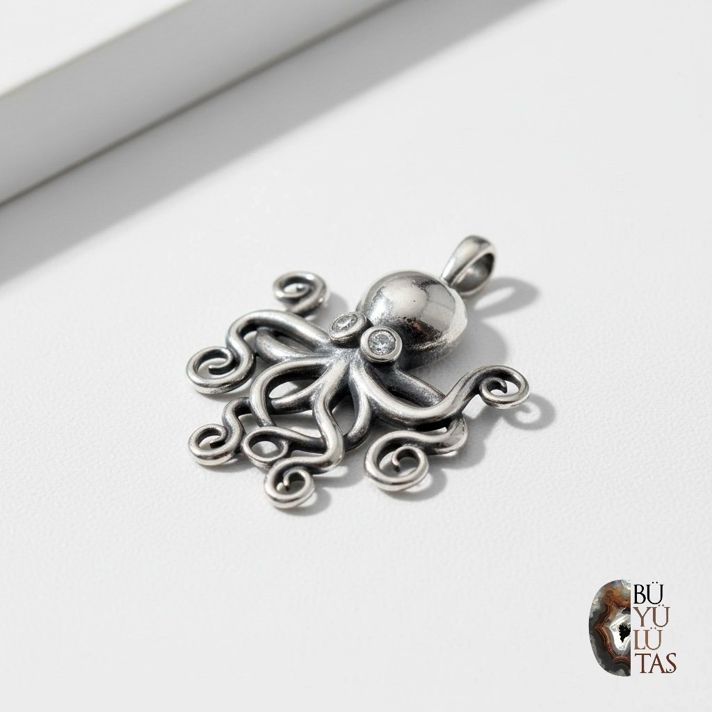 Denizin gizemli ve güçlü sembollerinden ilham alınarak tasarlanan bu ahtapot kolye ucu, kıvrımlı formları ve akışkan hatlarıyla dikkat çeken özgün bir tasarımdır.